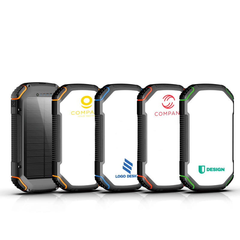 Our Outdoor Solar Wireless Power Bank is a great tool for when you’re out and about! It is equipped with a 20,000mA lithium battery with a rated capacity of 13,000mAh, which takes about 5 hours to fully charge (Type-C input 10W). It can charge an Iphone15 or Samsung s23 3 to 4 times when fully charged. We will use screen print, UV print to customize your brand’s logo. Both of its USB ports support 10W output and are also equipped with a wireless charging function with 5W output power, which can be charged without a data cable. This power bank has a camping light function and can also switch to a red and blue flashing warning light mode. Users can take this power bank camping everywhere, which can promote your brand very well.