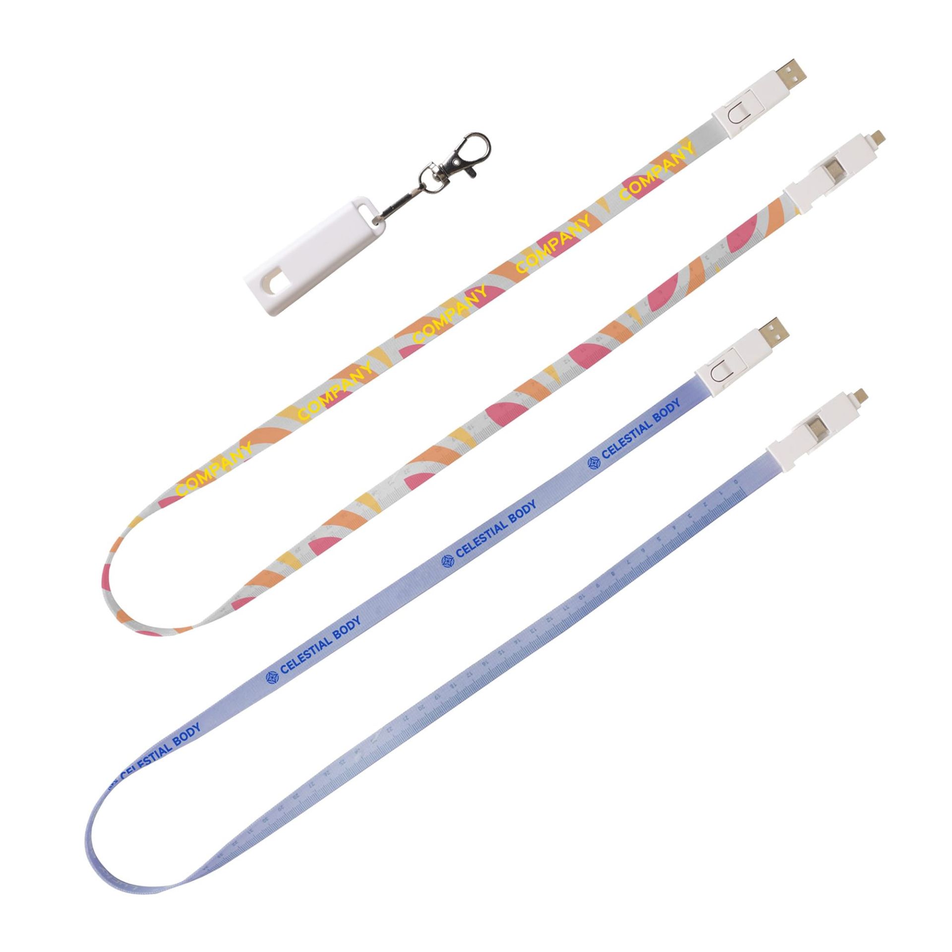 Get your branding seen with our new 6 in 1 polyester lanyard charging cable. Made from high quality polyester and ABS, comes with USB A, USB Micro, Lightning and Type-C connectors. With Sublimation print to highlight your design. This Lanyard Charging Cable easily integrates into any promotional campaign, provides both data transfer and charging functions, and is tougher than any other advertising cable out there.