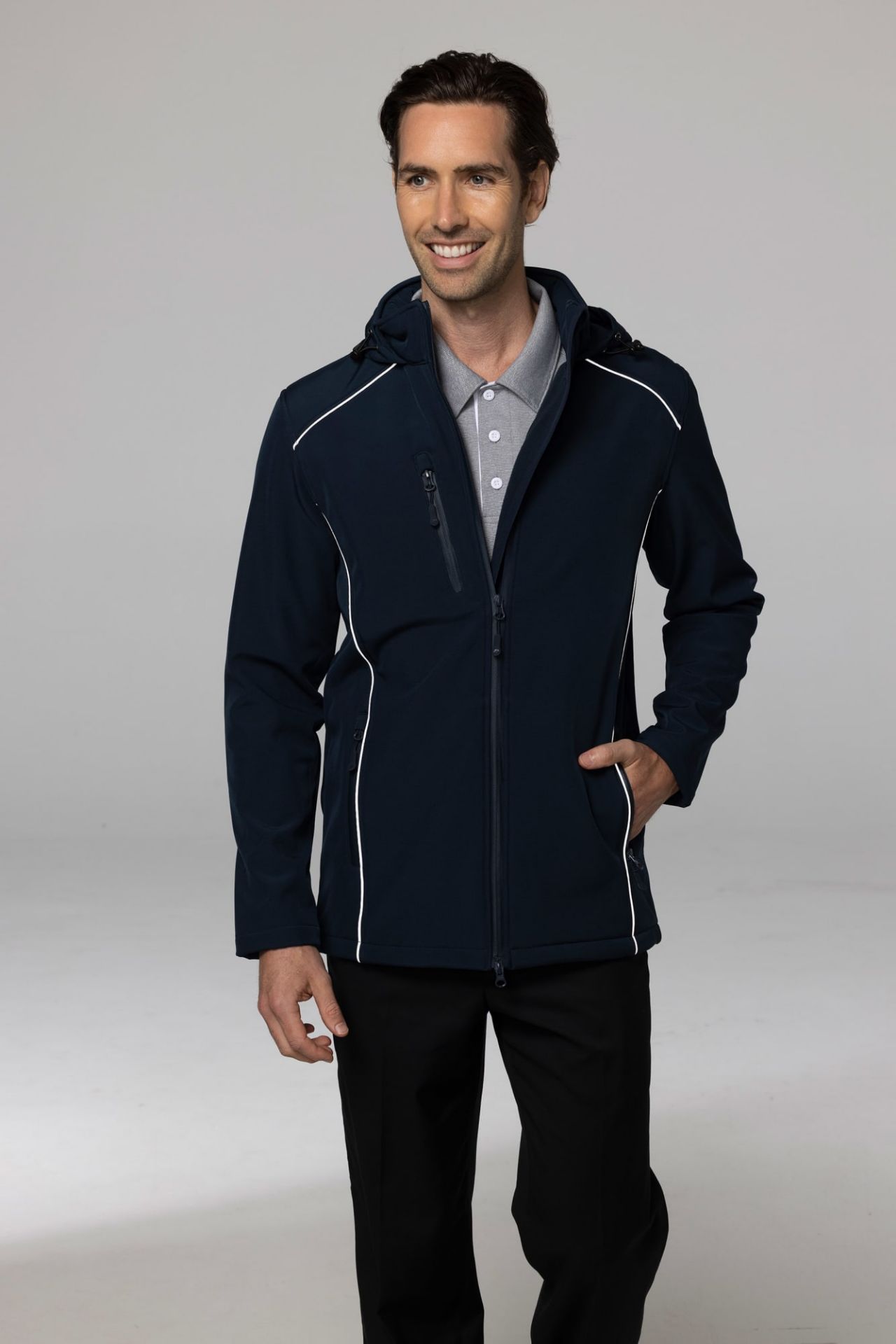 STYLE: 1531 Sizes: S-7XL Product Description: Designed to block the elements while remaining breathable and comfortable. We have taken all the technology and design elements from our award-winning Olympus jacket and the result is undeniably our most premium outdoor jacket. 10,000 windproof & 10,000 breathability rating, this outdoor jacket will arm you with confidence to tackle all conditions Fabric: 400gm 3 layer performance softshell Outer- 94% Polyester 6% Spandex Inner- 100% Polyester Waterproof: 10000mm | Breathability: 10000mm Features: CF double head (2 way) waterproof reverse tape nylon zipper Self fabric concealed hood with 100% polyester velour lining Adjustable hem with elastic cord & toggle Body length is longer than Olympus jacket Front & back side panel and front yoke with reflective tape piping