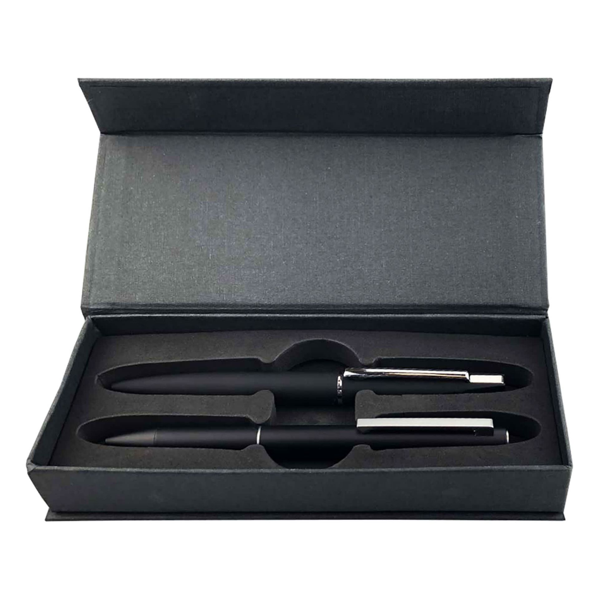 This gift set includes the Axel metal pen, a modern executive design with a rubberized twist-action upper barrel made from plastic and a stainless-steel lower barrel with chrome mirror finishing and shiny silver trim. It’s paired with the Medea metal pen, featuring a stainless-steel twist-action barrel with a shiny matte finish and silver accents. Both pens are supplied with a high-quality metal cross-type German-manufactured black ink refill, offering 1200 meters of writing distance with a tungsten carbide ball for smooth writing. Presented in a magnetised black gift box with a foam insert, perfect for corporate gifting.