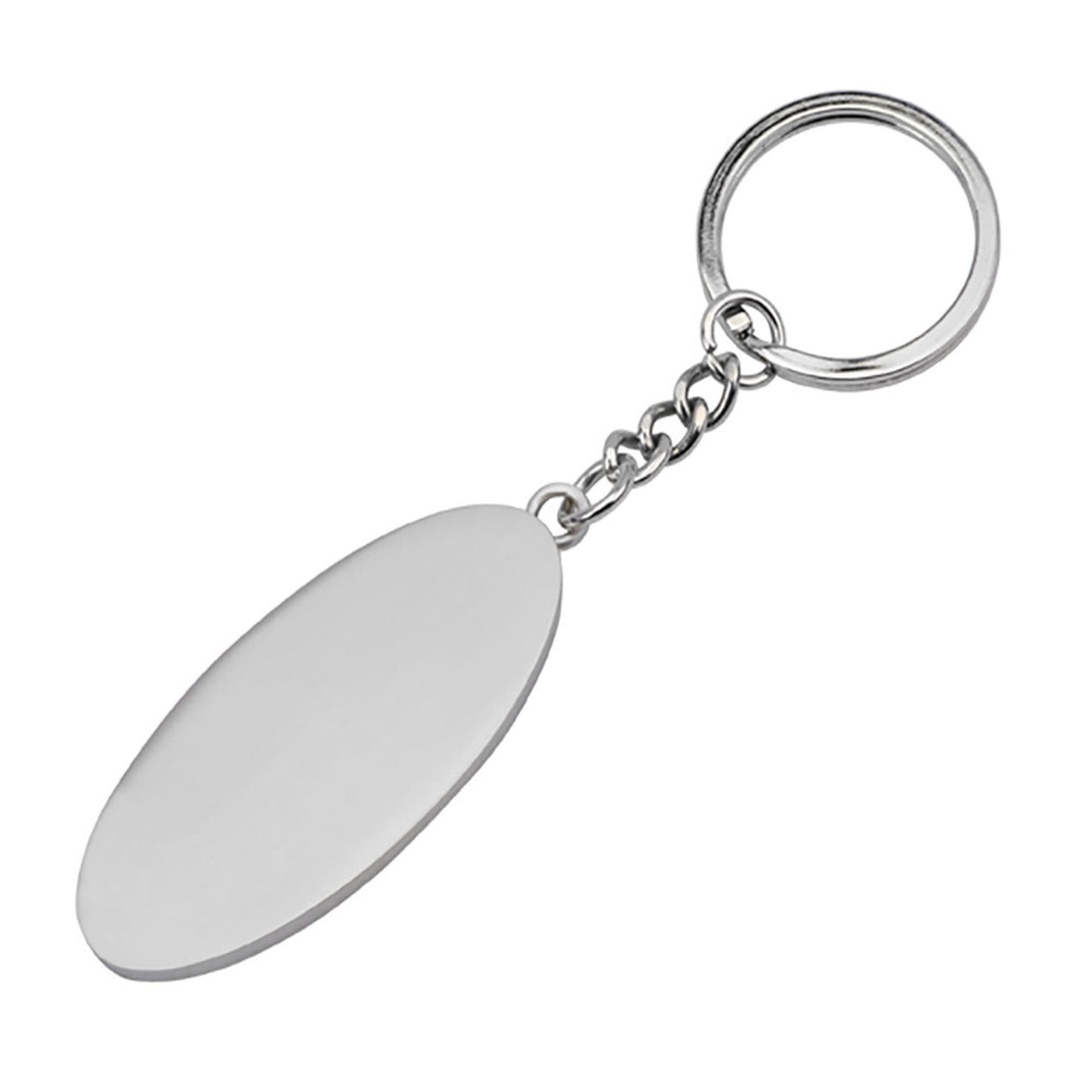 An oval-shaped simple design key ring made of zinc alloy metal in matt can be laser engraved and printed print may fade over time.