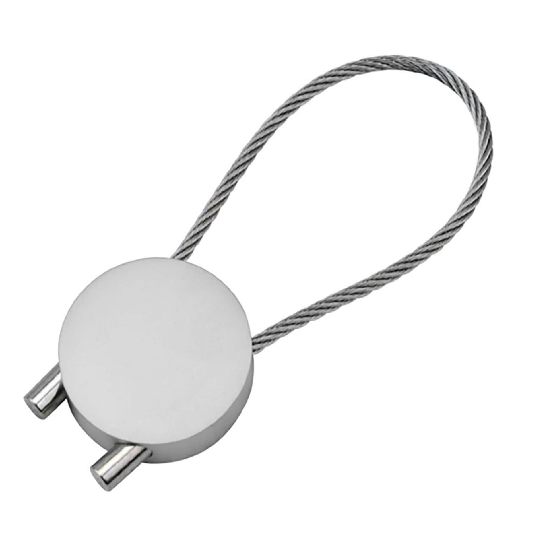 A round metal key ring with a cable clasp made of zinc alloy metal in shiny gloss chromed unscrew the nib to release the cable for putting keys in can be laser engraved and printed print may fade over time a great promotional product.