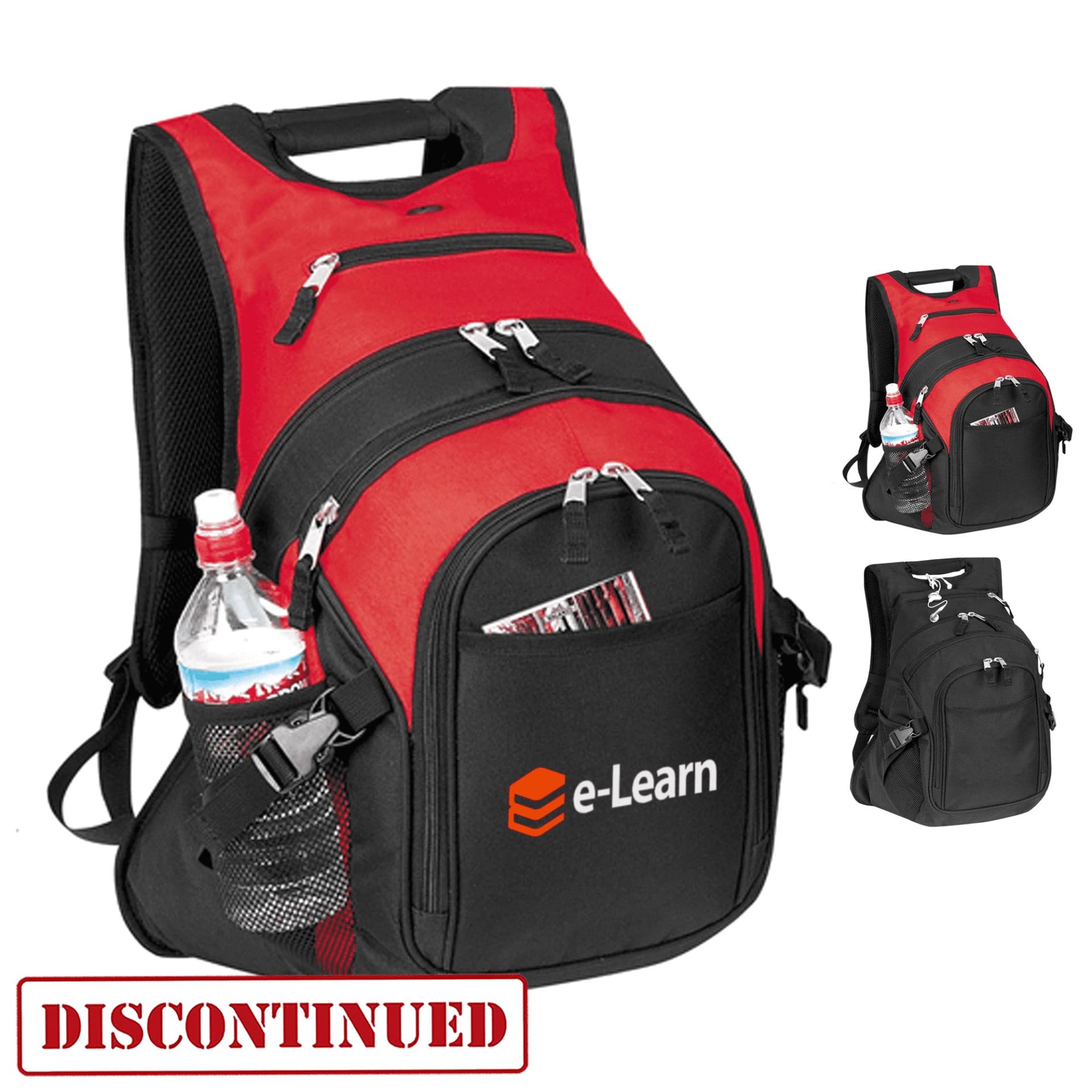 2 compartment computer backpack made from 600D polyester with heavy vinyl backing. 1 front zipped pouch and 1 opened front pouch 2 mesh side pockets. Comfortable wide thick carry stripes.