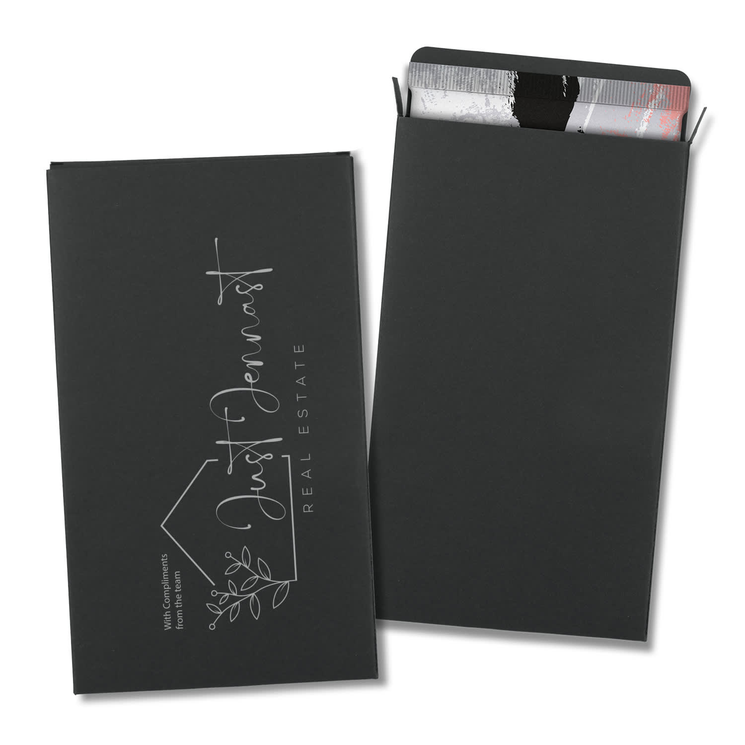 The large Hazel Chocolate Gift Box offers a stylish, simple way to customise chocolate blocks for branded gifts or kitting. Made from durable 300gsm black kraft card, it can be branded with your logo or message using a one-colour screen print. Perfect for enhancing any chocolate gift experience, this box leaves a lasting impression. Features: * Large customisable gift box designed to hold a block of chocolate * Made from 300gsm black kraft card * Fits most 200-250g blocks * Great product for branded gifts and kitting