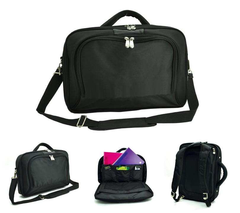 Main zippered compartment with inside padded laptop holder, Large front zippered pocket with inside pouch and pen holders, Hideaway and adjustable backpack strap, Adjustable and detachable shoulder strap