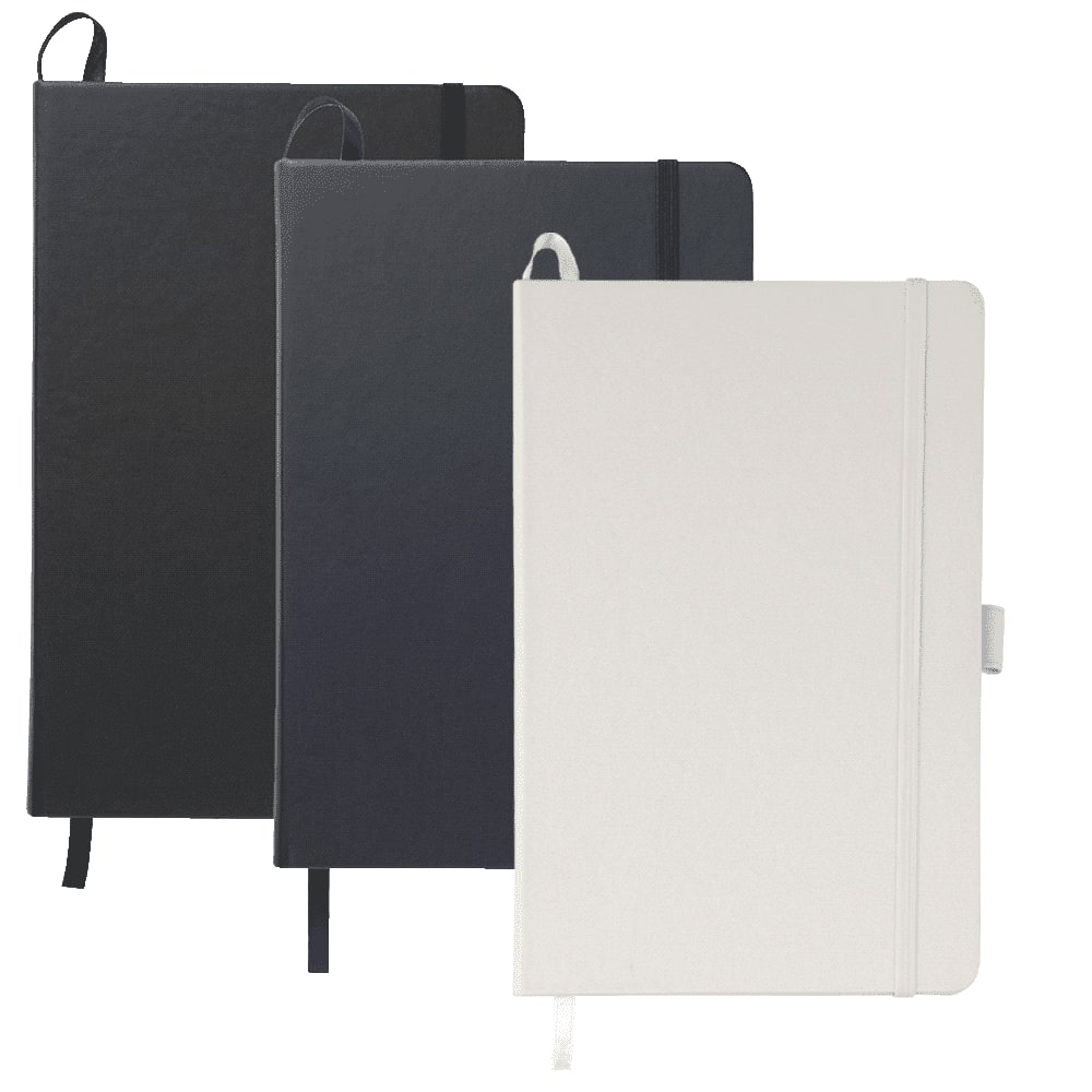 The mela recycled JournalBook ® presents a uniquely crafted hardcover, color-matching elastic closure, pen loop, and ribbon page marker, with 39% of apple components.