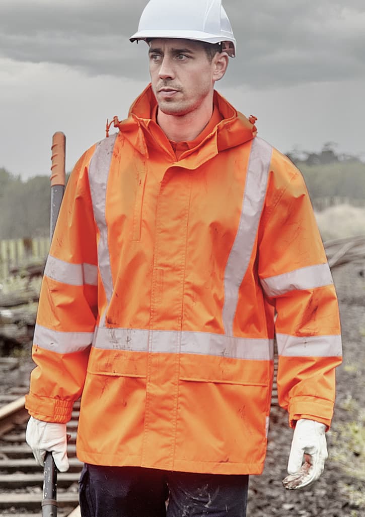Features: Waterproof and seam sealed Waterproof rating 10,000mm X Back NSW Rail tape compliant design with Bio Motion arm taping Mesh lining Chin guard for added comfort Reflective tape Embroidery zip for easy access Storm flap over nylon zipper Concealed adjustable hood and cuffs to stop the rain getting in 2 Front pockets with flaps and closure 1 Chest pocket with zip Fabric: 100% 300D Oxford Polyester Sizes: XXS - 5XL, 7XL