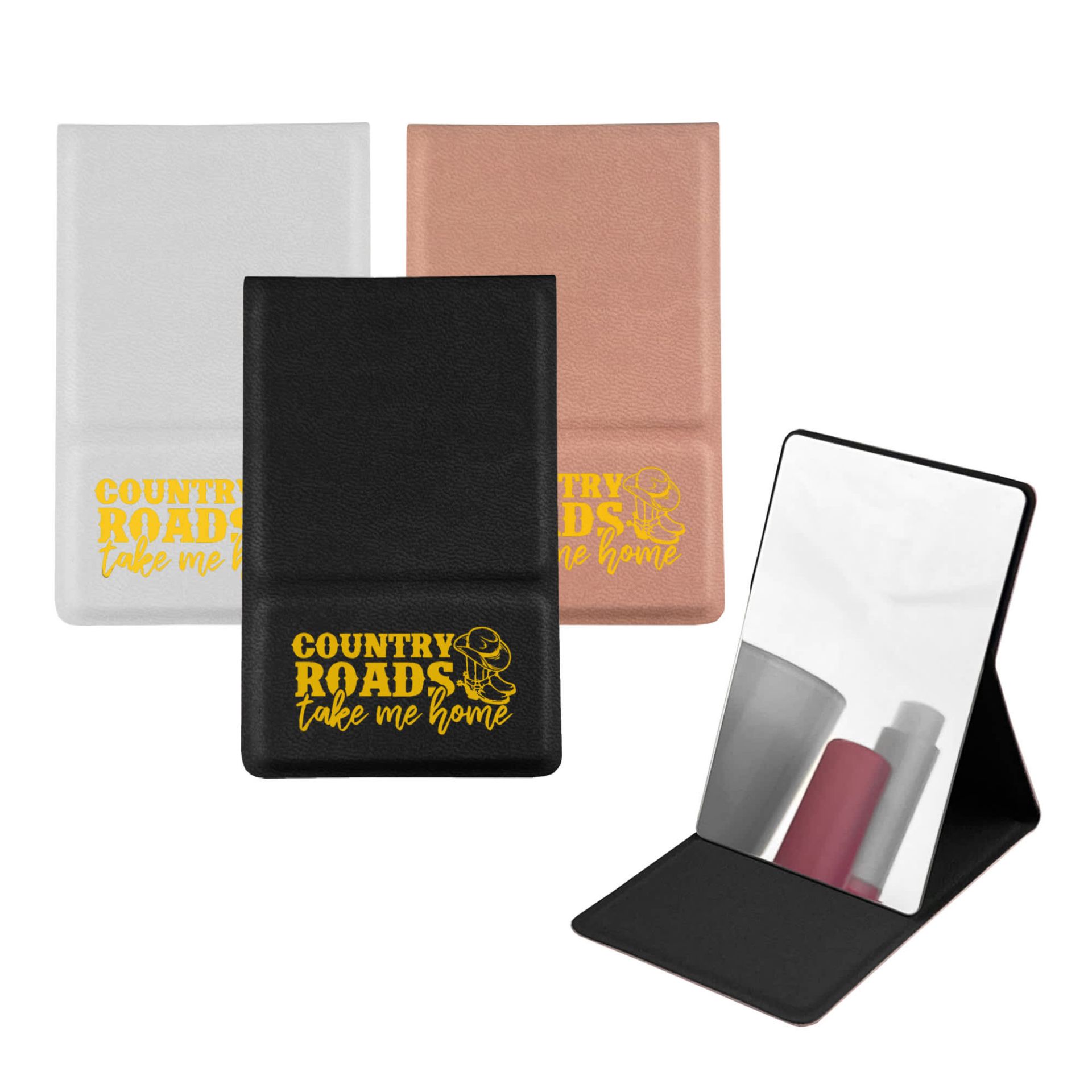 Compact pocket mirror with stainless steel polished mirror finish in a range of coloured high quality leather case covers which can be debossed. Flexible folding up to 90 125 and even 160 degrees. It also can be used as mobile phone holder.
