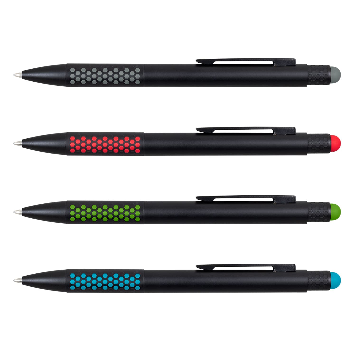 Functional pen and stylus in one. It is a retractable aluminium ballpoint pen with a stylus tip with 1200 meters of blue German-manufactured Dokumental ink. The pen features a lacquered matt black barrel with a unique PU frosted coloured grip for comfortable writing. Paragon Stylus Pen can be presented in an optional pen sleeve. Features: * Retractable aluminium ballpoint pen with stylus * 1200 metres of blue German manufactured Dokumental ink * Lacquered matte black barrel with a unique PU frosted coloured grip * Tungsten carbide ball * Optional pen sleeve available