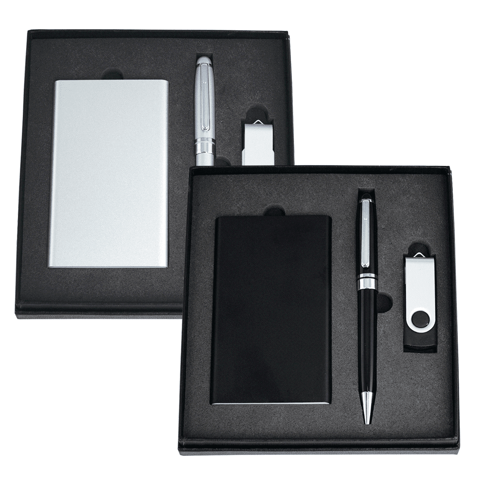 This gift set is made up of the model PB1002 4000 mAh Powerbank, the 6002 Bristol Twist Ballpoint Pen, and the 7860_8 Rotate USB - 8GB.