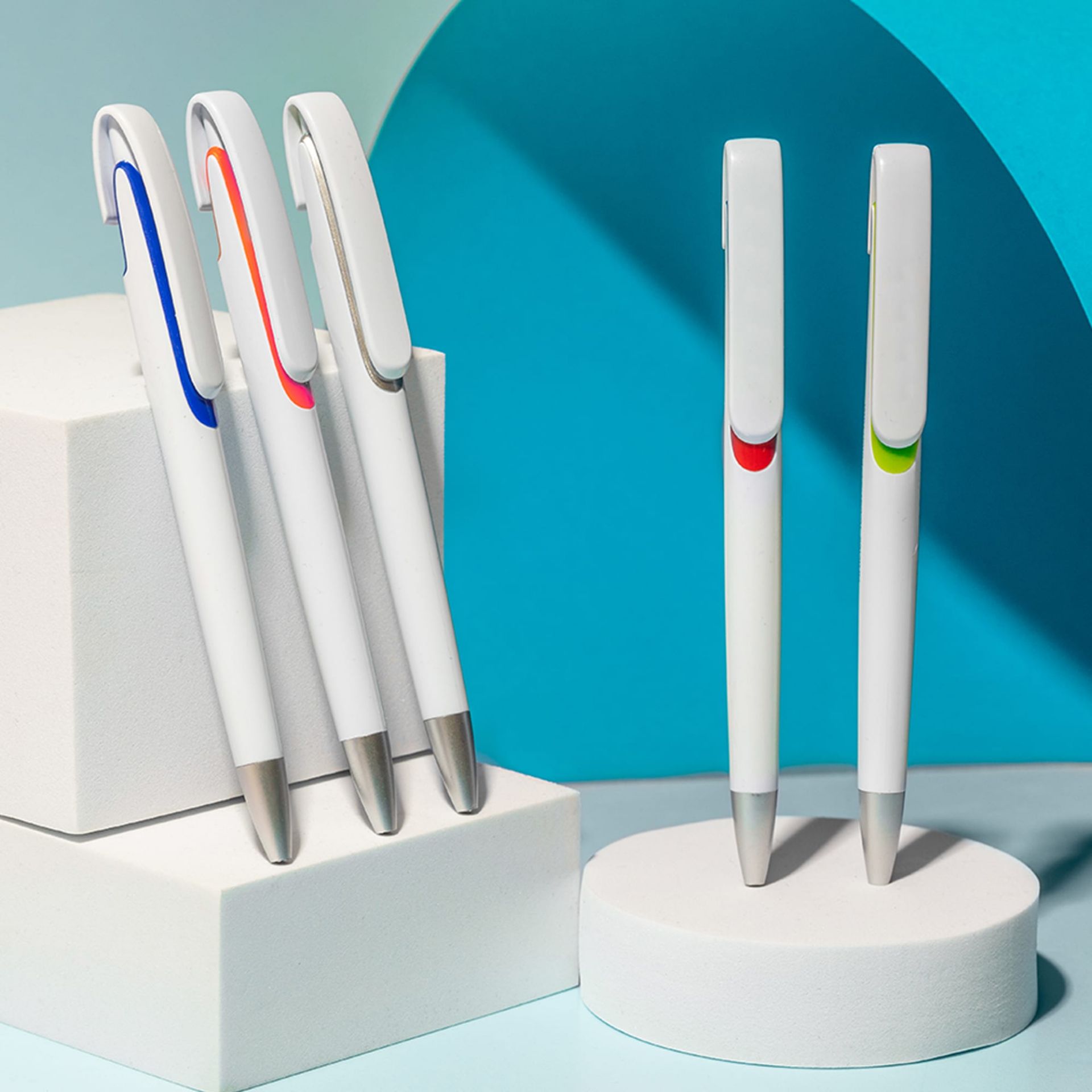 Click action plastic pen with broad printing area on clip white opaque barrel and clip a small coloured panel beneath the clip which highlights the pen design matt silver chrome tip. It has high quality German manufactured black ink refill 1800 meters writing distance tungsten carbide ball provides you with quality writing.
