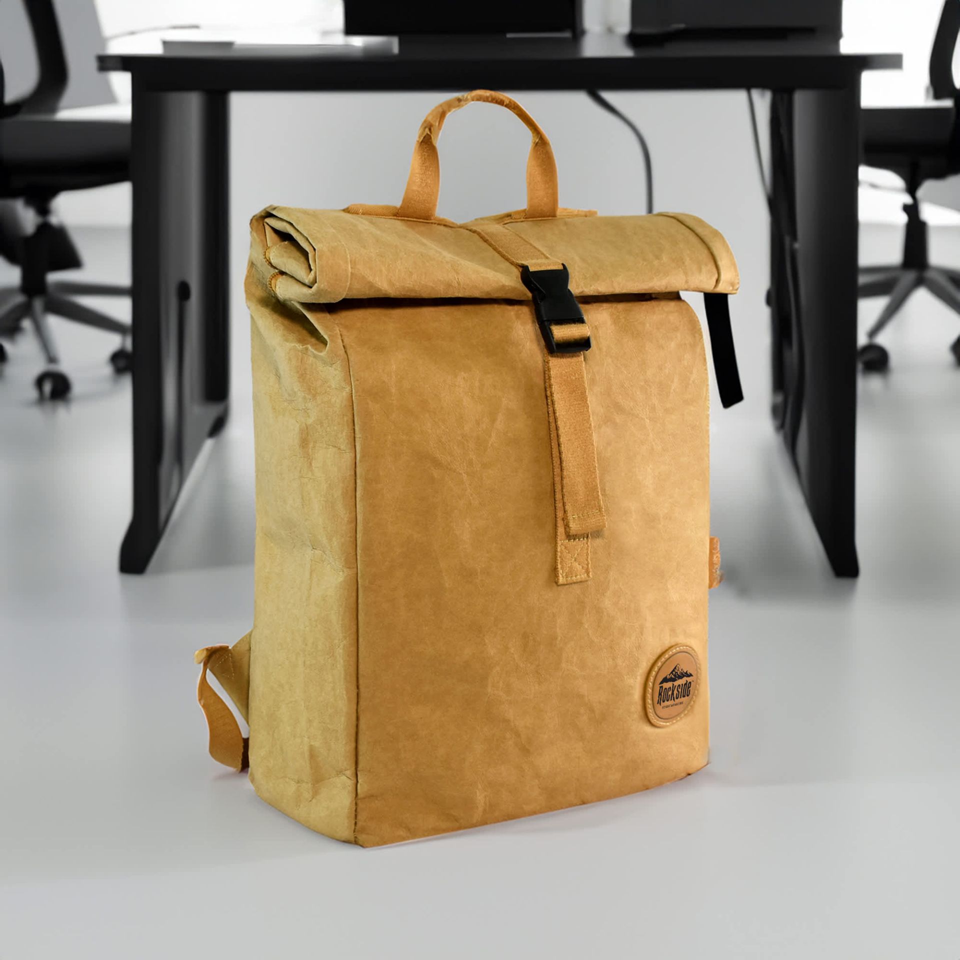 The Star Kraft Paper Laptop Backpack combines durability functionality and style making it suitable for various purpose. The German 0.55mm washable kraft paper material gives it a unique and eco-friendly touch while the combination of different materials and pockets offers practicality and organization. With a laptop compartment a back panel zipper pocket and other interior pockets it allows users to carry their electronic devices essentials and water bottles conveniently and securely. It has a polyester cotton webbing handle and adjustable brown canvas shoulder strap with top zip closure.