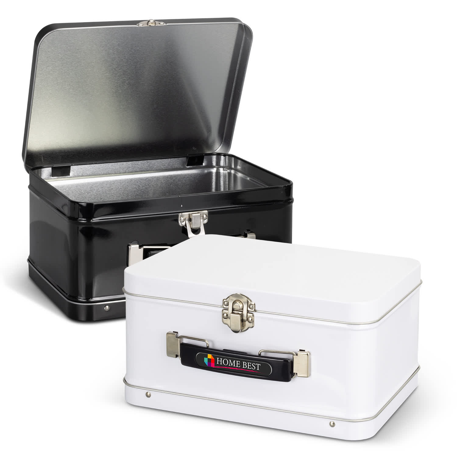 Retro 800ml tin lunch box with a black carry handle. Features: * Retro 800ml tin lunch box with black carry handle * Kraft gift box packaging