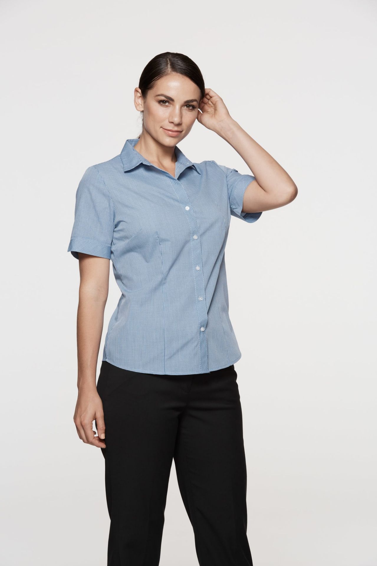 STYLE: 2901S Sizes: 4-26 Fabric: 65% Polyester 35% Cotton Features: This smart mini-check has a bias cut pleated placket with a hidden Magic Button Top stitching on the placket and cuff Anti-pilling treatment. 3 Colours: Black/White, Purple/White, Navy/White