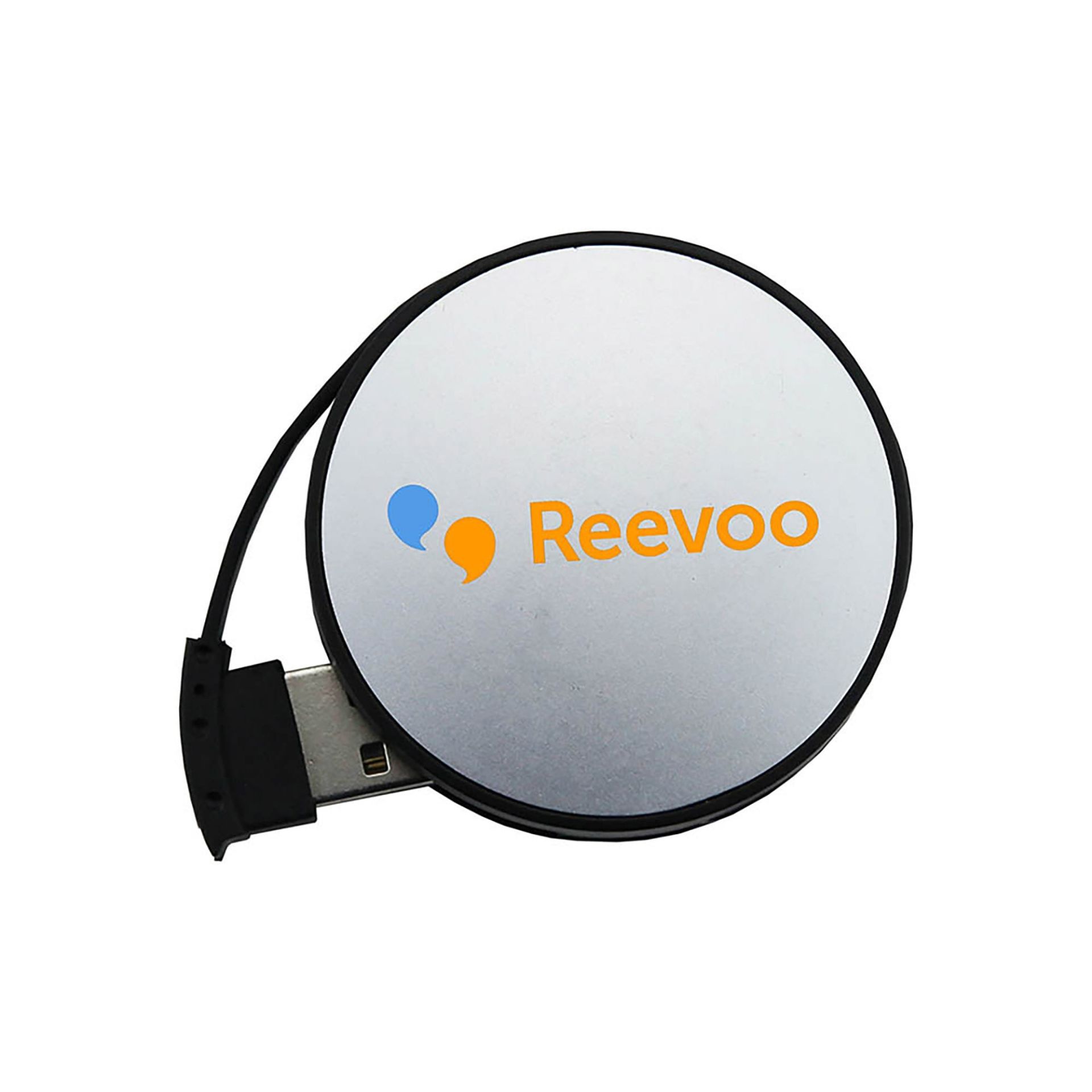 Round plastic USB hub with four ports and a USB 2.0 interface the cable locks into the housing neatly when not in use silver top and black back.