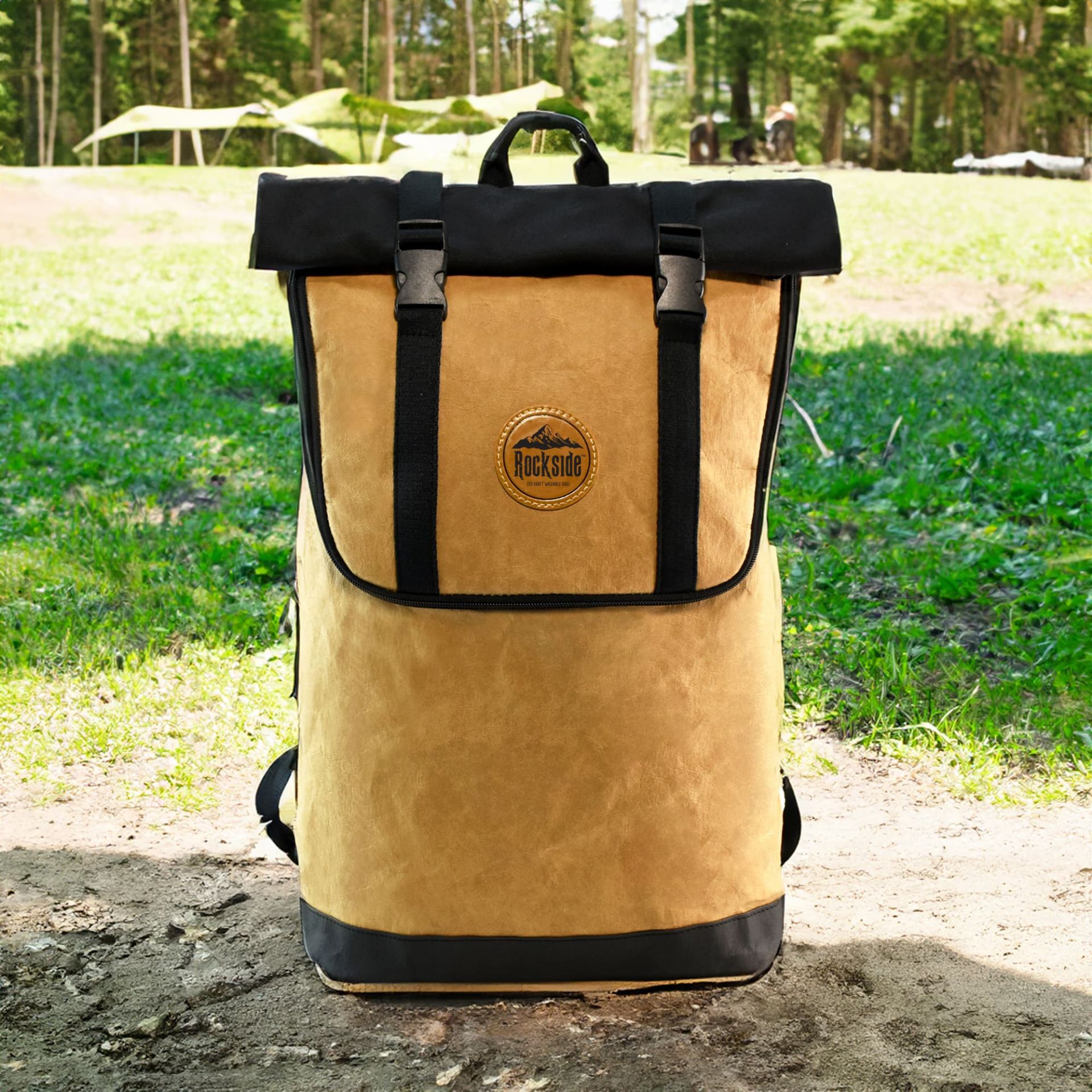 Village Kraft Paper Laptop Backpack offers a combination of style durability and functionality. Made of 0.55mm German washable kraft paper and gray canvas inner lining with adjustable black polyester strap buckle closure along with the unique black canvas strap adds a distinctive touch to the backpack's design. The multiple pockets and compartments provide ample space for organizing and carrying essentials while the adjustable shoulder straps and comfortable back panel enhance overall wearability.