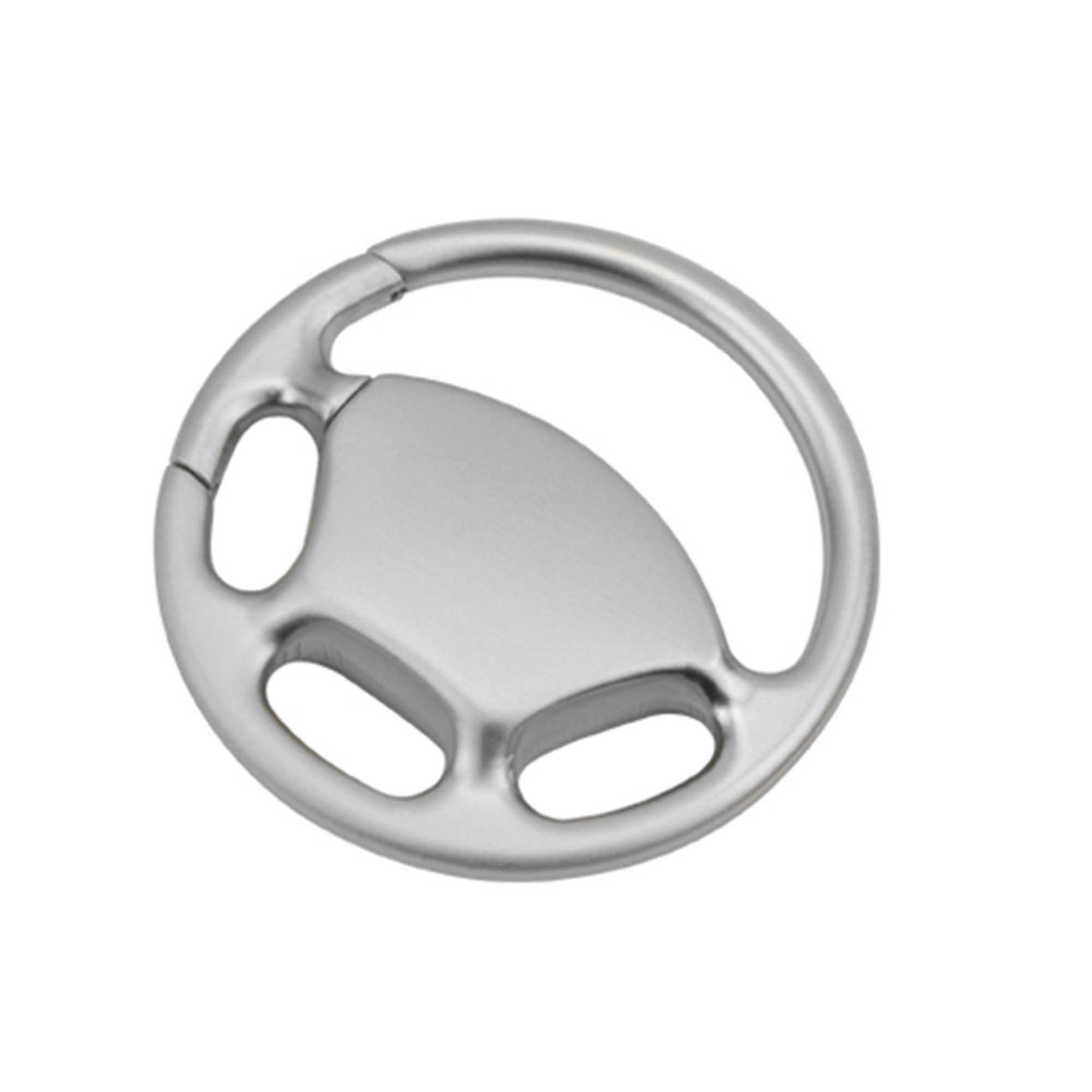 A car steering wheel key ring made of zinc alloy metal and matt finishing a great promotional item for car and truck industry can be laser engraved and printed print may fade over time.