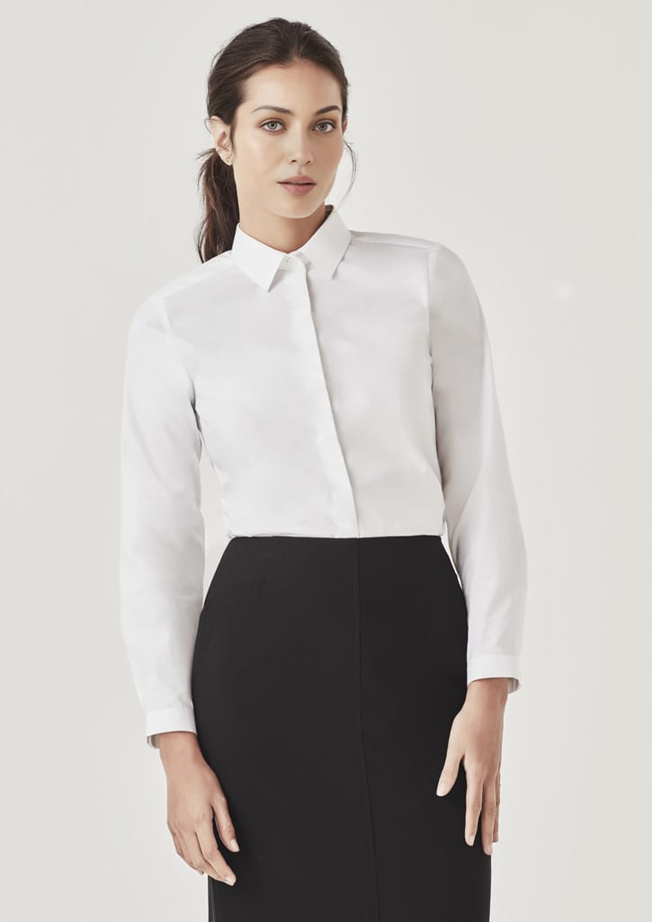 Features: A range of smart casual shirting in modern styles and shapes, suitable for all work environments. Cotton-rich shirting will keep you cool and dry, with mechanical stretch for comfort. Semi-fitted style, with a relaxed fit through the body. Concealed front placket, dart detailing and secret bust button located inside the placket. Fabric: 60% Cotton 40% Polyester, with mechanical stretch. Black, Navy, Blue, Silver: 117gsm. White: 130gsm. Black UPF 50+ Excellent. Navy UPF 50 Excellent. White, Blue, Silver UPF 15 Minimum. Sizes: 4 - 26 (AUS/NZ)