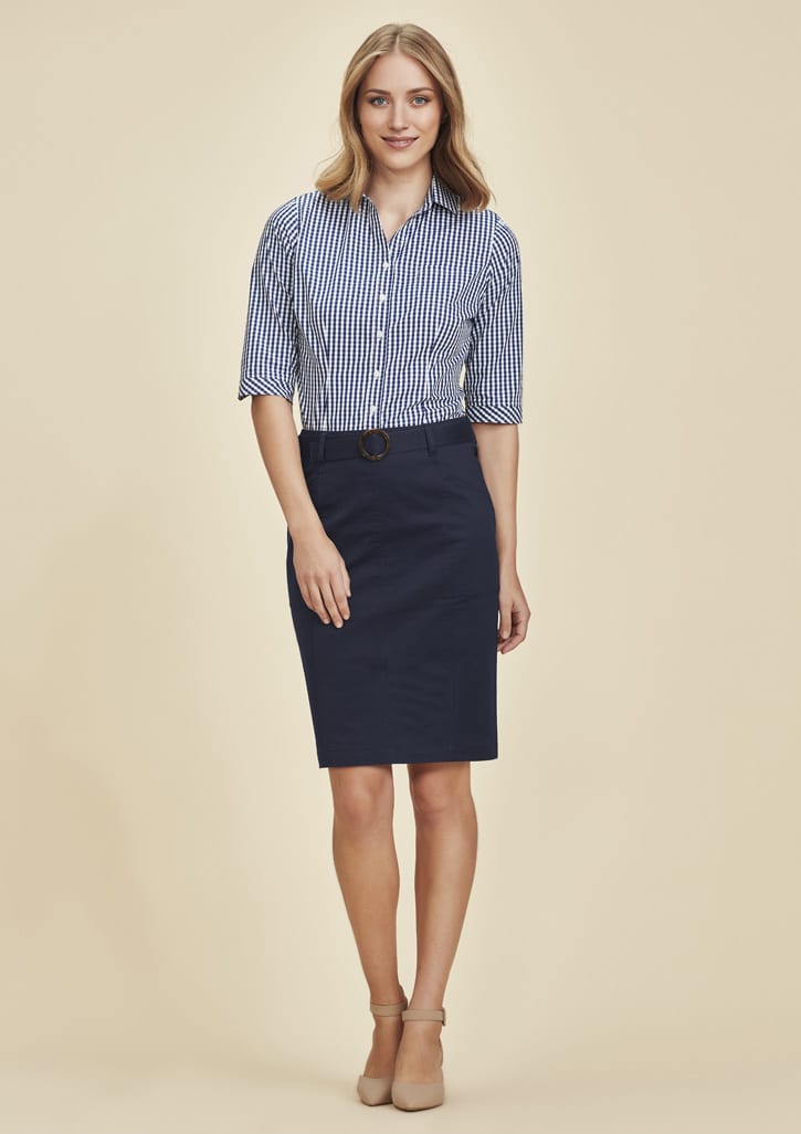 Features: A modern Chino skirt featuring functional back split, non-gaping side seam pockets, metallic back zip feature, belt loops and modern trims. Pencil shape designed to finish mid length, but will vary depending on wearers height. Detachable belt included. Fabric has added stretch for comfort and easy movement Fabric: Main: 97% Cotton 3% Elastane, Trims: 100% Cotton Chambray. Soft peached hand feel. Remove belt before washing. Wash before wearing, machine wash cold, inside out with like colours. Do not bleach, hang to dry in shade. Can be tumble dried on low. Cool iron. Dry cleanable (P). Sizes: 4 - 26. (AUS/NZ)